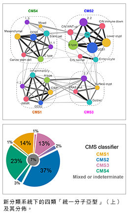 根據新的分類系統,近九成的大腸癌可分作四類「統一分子亞型」(Consensus Molecular Subtypes),每類「統一分子亞型」有其分子和病徵特點。例如獲診為第四類「統一分子亞型」的病人,較易出現腫瘤轉移,整體存活率亦較低;獲診為第二類「統一分子亞型」的病人,即使病情復發,其存活率仍是較高。