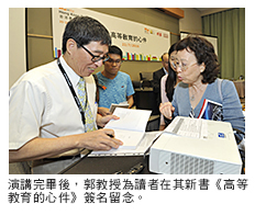 香港城市大學(城大)校長郭位教授7月22日出席香港書展「名作家講座系列」,以「高等教育的心件」為題演講,座無虛席。他其後出席「名作家朗誦會」誦讀其新書《高等教育的心件》中「學生與我」一節,並參觀城大出版社的攤位。