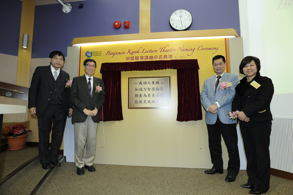 香港城市大學(城大)1月8日舉行命名典禮,以城大校友郭燦耀先生的名字將學術樓(一)的16號演講廳正式命名為「郭燦耀演講廳」,以表彰郭先生對大學的慷慨支持及對社會的貢獻。