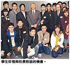 在近兩小時的對話裡,張教授與學生們愉快地探討了城大的抱負以及學生領袖應該擁有的質素。張教授鼓勵學生把握機會服務同學,盡量豐富自己的人生。「你們應該為城市大學之名深感自豪。你們肩負重任,要讓城大之名在校園外受到尊重與承認,」他說。張教授鼓勵學生繼續努力,平衡人文與科技教育,並在課堂內外都要養成求知習慣。