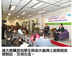香港城市大學校董會成員兼城大社區關係委員會主席孫大倫博士的人生哲理是「要做好本份、要自律」。他一直大力支持城大的發展,除了熱心參與教育事宜,更不遺餘力推動社會公益和文化藝術活動,貢獻良多。當然,這位出色的企業家還得日理萬機,打理其中港照相器材集團有限公司的業務。面對人生的種種挑戰和社會的急速轉變,他有甚麼成功之道和心得?在10月25日,城大教職員和學生有機會與孫博士面對面真情對話,互相交流,上了人生寶貴的一課。城大致力營造一個促進智性及個人成長和鼓勵交流的校園氣氛,這次分享會便是一個好例子。