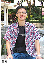 曾嘉畢業於武漢理工大學工程系,2003年9月開始於城大創意媒體學院攻讀研究院課程,將於明年中畢業。