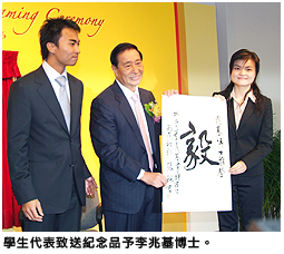 李兆基堂宿生代表、商學院三年級學生張璐於典禮上即席寫了一幅以「毅」字為主題的字畫,贈予李博士,以歌頌李博士捐獻教育事業的熱忱及回饋社會的抱負,並具備堅忍不拔的毅力?!浮阂恪蛔职恕号R事果決、不優柔寡斷』的意思,這正是李博士的寫照,」張同學說。