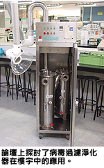 建築系特約教授蘇廷弼博士則介紹病毒過濾淨化器的結構和操作原理,及探討它在樓宇中的應用,以加強一般空調系統的空氣過濾過程。蘇教授說﹕「此病毒過濾淨化器除了可過濾病毒外,亦可以應用於樓宇中,例如可以用作空氣淨化器來阻隔塵埃和消滅細菌。」此淨化器在2004年非典型肺炎爆發後獲研究資助局研究基金資助開發,於實驗室及威爾斯親王醫院測試中證實能過濾及毀滅至少90%的病毒。