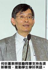 何教授說:「語文,尤其是英文,是建立國際觀的一個關鍵。在各位同事的努力下,我相信我們的學生將會透過社交活動和互聯(lián)網(wǎng),培養(yǎng)出學好英語的生活態(tài)度。」