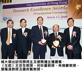 城大推出新的傑出研究獎計劃,旨在表彰及獎勵校內教研人員的傑出研究。經由校內校外成員組成的評審小組仔細遴選,首屆傑出研究獎由朱教授奪得,而張教授更獲頒傑出研究獎大獎。