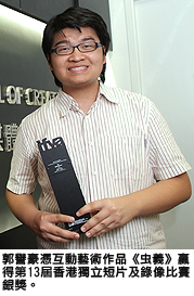 就讀創(chuàng)意媒體碩士課程一年級的郭譽豪以多觸點技術(shù)創(chuàng)作了螞蟻吃蛋糕的新媒體藝術(shù)作品《蟲義》,奪得單螢?zāi)换用襟w組銀獎。參與者可透過桌上的多觸點裝置摸擬以手指壓死正在把蛋糕屑抬走的螞蟻。隨著遊戲的進行,畫面會不斷變化,挑起參與者不斷殺戮、弱肉強食的自然慾望。