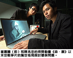 崔嘉曦與陳兆忠的得獎動畫《森.願》,以末世戰(zhàn)爭片的驚世格局探討環(huán)保問題。故事講述未來世界的女孩參與遊行,抗議大財團大興土木破壞環(huán)境,被捉拿入獄,她為逃獄而服食老樹給她的藥物變成了樹,可惜最終仍難逃一死。崔嘉曦表示故事是嘲諷大財團對環(huán)境的破壞力,並以片名《森.願》的諧音,表達對追求環(huán)保的心願。