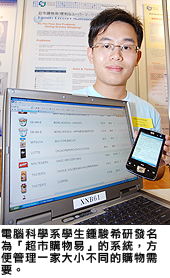 電腦科學系學生鍾駿希研發名為「超市購物易」的電子系統,方便管理一家大小不同的購物需要。家庭成員可在電腦或電子手帳上利用該系統訂立購物清單,系統則會記錄每名成員的喜好,建議選購哪些貨品,也會提醒哪些日用品即將用完、需要添置。