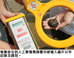 馬蹄蟹的學(xué)名為「鱟」,在地球上已生活了大約四億年,身體構(gòu)造基本維持不變,故有海洋生態(tài)活化石之稱。由於年幼馬蹄蟹身軀細(xì)小,城大研究人員花了數(shù)月時(shí)間才找到合適的晶片。為避免馬蹄蟹脫殼時(shí)把晶片一同脫下,研究人員經(jīng)多次測(cè)試才確定植入晶片的位置。現(xiàn)時(shí)使用的晶片體積細(xì)小,具備編碼功能,研究人員能夠根據(jù)晶片號(hào)碼識(shí)認(rèn)個(gè)別馬蹄蟹。