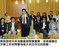 郭教授以經(jīng)營餐廳為喻,強調(diào)後勤支援的重要性,並感謝各部門同事多年如一日的全力支持。「一家餐廳單靠出色的廚師未必就能客似雲(yún)來,還要配上侍應生等職員的出色服務,才能成功。同樣,城大的成功,擔當支援工作的職員功不可沒,沒有你們的突出表現(xiàn),單憑我和教學人員努力,不可能做出優(yōu)秀成績,」郭教授說。