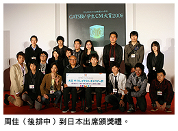 比賽收到來(lái)自日本、南韓及香港約250份學(xué)生作品,經(jīng)過(guò)初步評(píng)審及網(wǎng)上投票後選出包括周佳等20名學(xué)生的候選得獎(jiǎng)作品。周佳因此獲得遠(yuǎn)赴日本交流的機(jī)會(huì),與日本資深廣告創(chuàng)作人員交流動(dòng)畫及廣告製作經(jīng)驗(yàn)和心得,獲益良多。