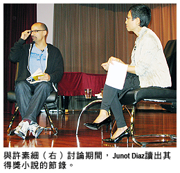 數(shù)百文學(xué)愛(ài)好者聚集在惠卿劇院,聆聽(tīng) Junot Diaz 解說(shuō)他的作品。在講座上,他與城大首位駐校作家許素細(xì)女士對(duì)談,詳細(xì)描述其作品中多姿多采的角色,獨(dú)一無(wú)二的寫作風(fēng)格,以及融入社會(huì)評(píng)論的場(chǎng)景與情節(jié)。是次活動(dòng)是城大普立茲獎(jiǎng)講座系列的首場(chǎng)。英文系系主任 Kingsley Bolton 教授致歡迎辭後,許女士概述了這位「文學(xué)明星」的事業(yè)及工作。