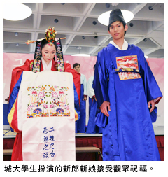 多名城大師生和居港韓國人士身著韓國傳統婚禮服飾,重現韓國習俗婚嫁喜慶的各項禮儀,其他包括奠雁禮(贈送大雁)、交拜禮(新婚夫婦互拜)和合巹禮(夫婦飲交杯酒)。