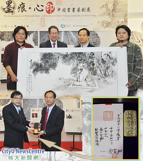 香港城市大學(xué)(城大)邵逸夫圖書館正舉辦「墨痕?心印」中國書畫篆刻展,展出書法家廖亞輝先生(上排左一)、篆刻家廖富翔先生(上排右二)和畫家張有鑄先生(上排右一)共四十多件作品。