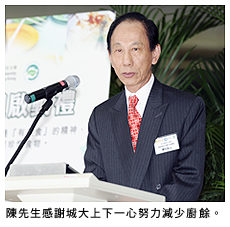 在啟動典禮上,行政總監陳世民先生代表城大管理層致辭,感謝全校師生員工及合作團體的共同努力,並指出城大減少廚餘的措施已喜見成效。