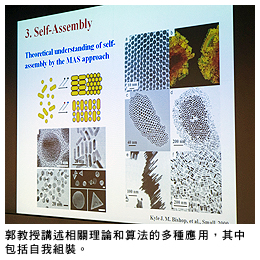 在演講的前一部分,郭教授介紹集群行為研究的最新進展,並講述這一領域中的一些理論和模型。然後,郭教授提出了「軟控制」這一概念,藉此「介入」模擬的動物集群行為,以求對此課題有更深入的了解。