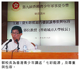 香港城市大學(城大)校長郭位教授7月19日為第九屆「香港青少年軍事夏令營」的德育講座擔任講者,從有關七類能源的利弊取捨之爭說起,為年輕人講述尊重與包容對香港社會的重要意義。