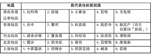 「2013年LIVAC泛華地區(qū)中文新詞榜」的編製,主要客觀依據(jù)各地區(qū)華文報(bào)章上新詞的出現(xiàn)頻率。各地區(qū)最具代表性的五個(gè)詞語如下表所示: