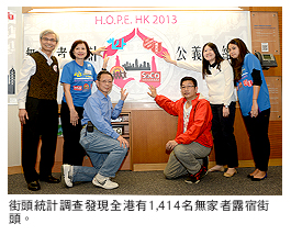 當晚的統計調查,得知有720名街頭露宿者,加上415名暫時棲身於臨時住所及露宿者市區宿舍的人士、279個街頭空置宿位,估計截至2013年8月,缺乏安定或永久住所的人士共計為1,414名。