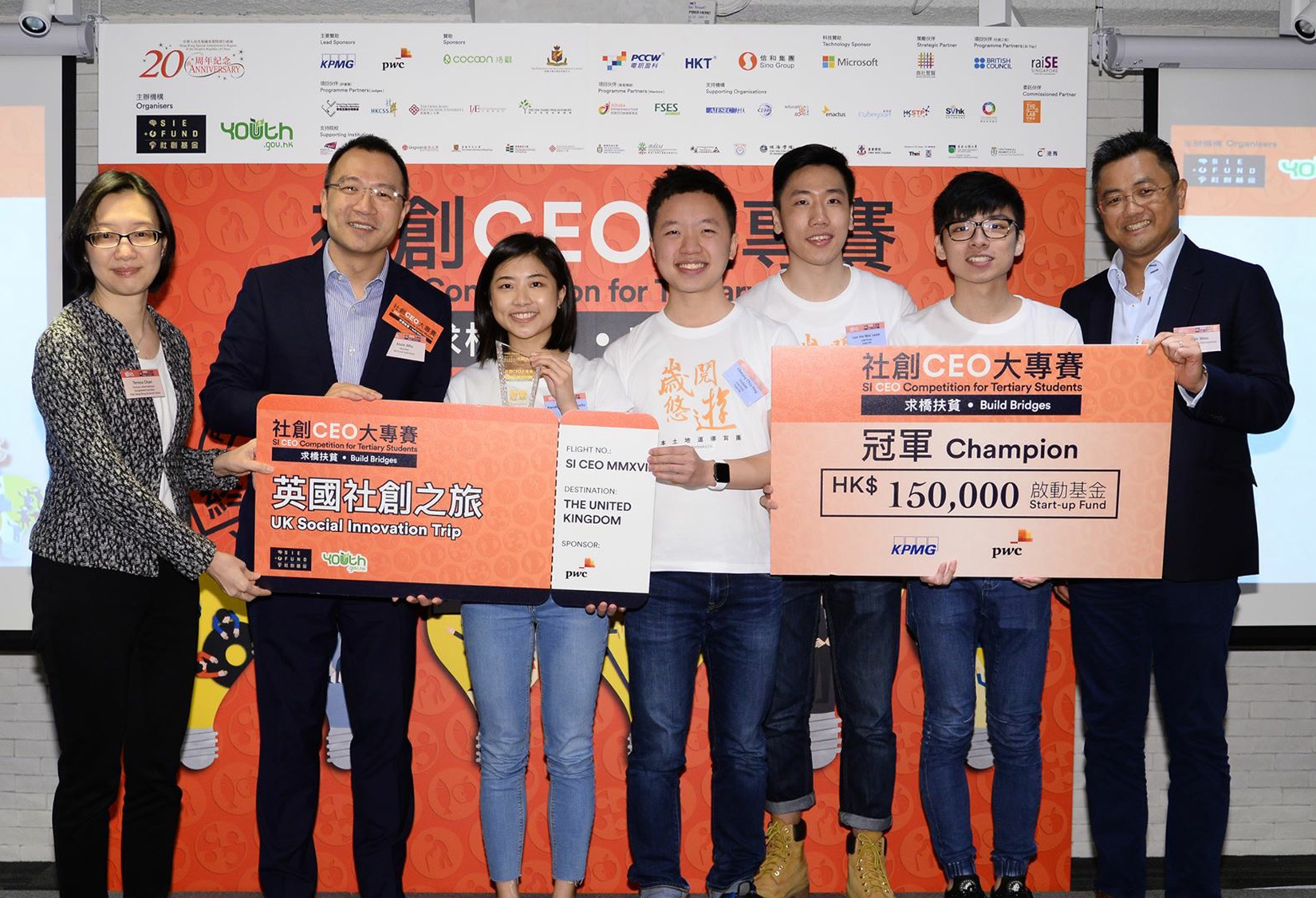 社創CEO大專賽由社會創新及創業發展基金和政府青少年網站合辦。得獎計劃名為「歲閱悠遊」,旨在招募熟悉社區及樂於與人分享的長者,設計導賞路線,經培訓後帶領導賞團,長者每次帶團可獲數百元酬勞。計劃不但讓長者老有所為,也可幫補生計。