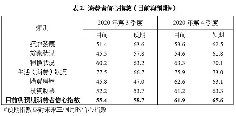 消費者信心指數在五個範疇均錄得上升,包括:購買房屋、投資股票、就業狀況、物價狀況和生活(消費)狀況。